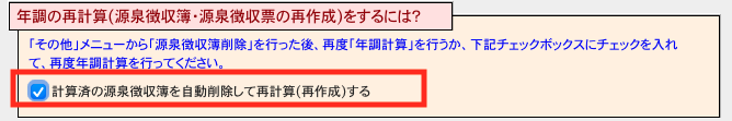 ※不具合内容「1.年調社員情報で「給与以外所得」の金額の入力がある場合....」に該当する場合は、修正版インストール後、再度年調計算を行って下さい。その際に、「□計算済の源泉徴収簿を自動削除して再計算(再作成)する」のチェックボックスに印をつけて下さい。